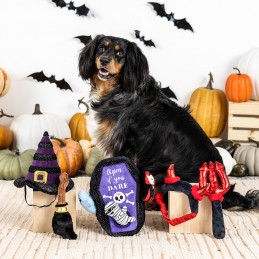 A superstitious stack! PetShop by Fringe Studio's “Stack-O-Lantern” plush toy is perfect for playtime, anytime. This toy was designed with interactive play in mind with a loud squeaker and crazy crinkle paper in each tree section, plus a tuggable rope with sliding toy function. Whether you squeak, crinkle, tug, or toss it, this spooky crew will keep your pup lurking for more.