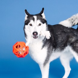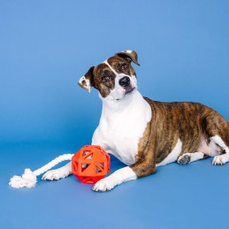 Dim. 11,5x11,5cm. Dispensador de golosinas + cuerda + caucho natural + tirar + morder + tirar + recuperar + apto para lavavajillas + apto para congelador + rebote irregular. Embalado por pieza.