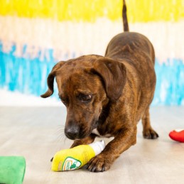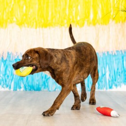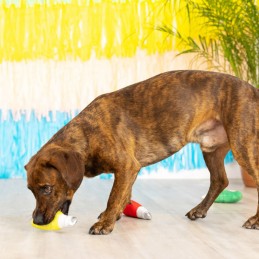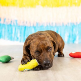 Afm. per speeltje ongeveer 15 x 6,5 cm. Luide pieper + Knisperpapier in elk speeltje. Verpakt per set.