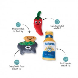 De 3-delige miniknuffelset "Happy Hour Pack" van PetShop by Fringe Studio is perfect voor de pup die graag de hele dag speelt. Dit trio is gemaakt met een luide pieper en gek kreukelpapier in elk speeltje en is de perfecte starter voor jouw pup.